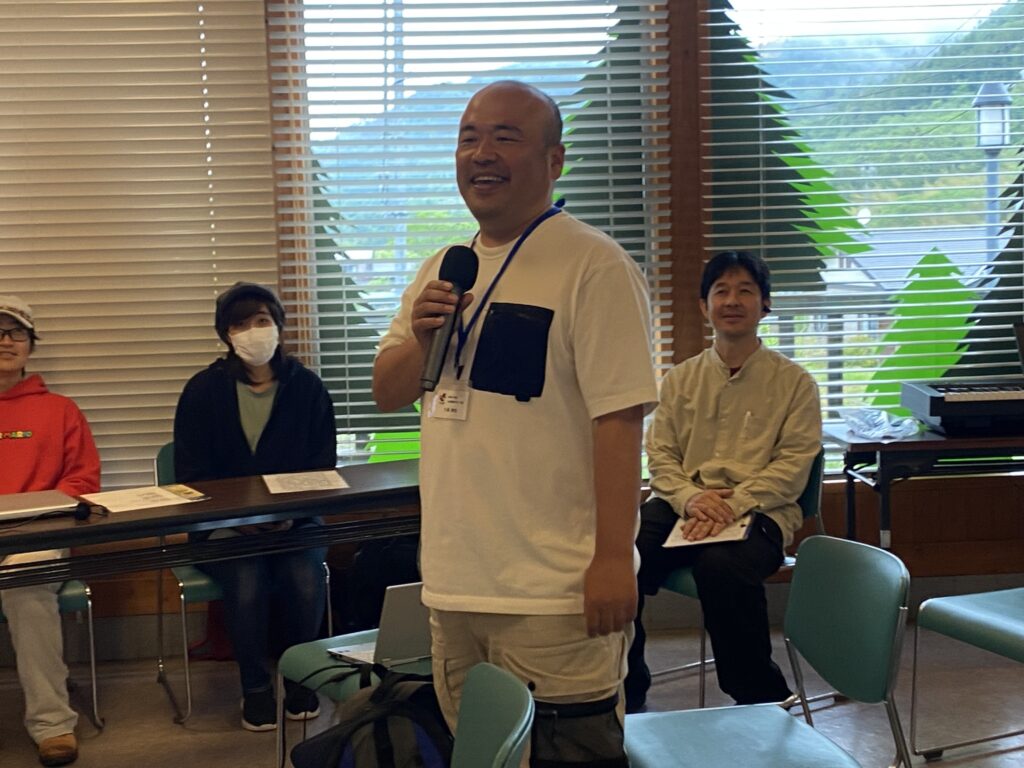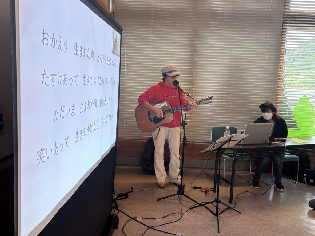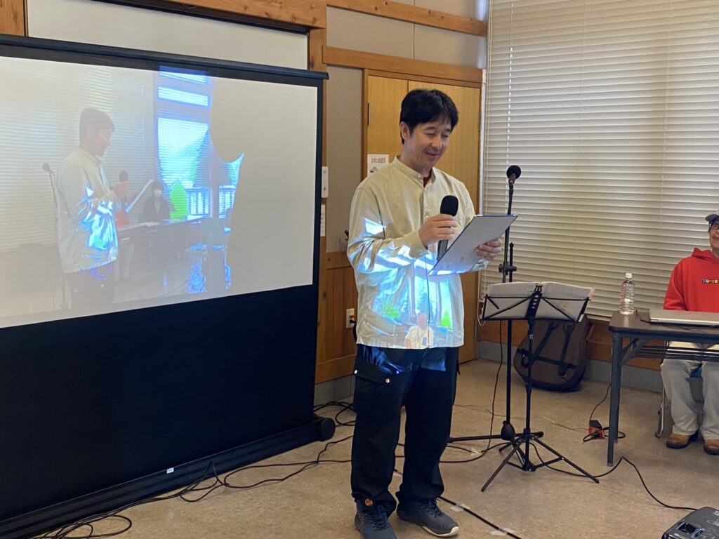 講師は、同じ宮城県内の石巻市雄勝町より「おたすけおんがく隊」の古田康祐先生に地元講師としてお越しいただき、『音楽・協同・まちづくりで拓く新しい生き方』というテーマでお話しいただきました。