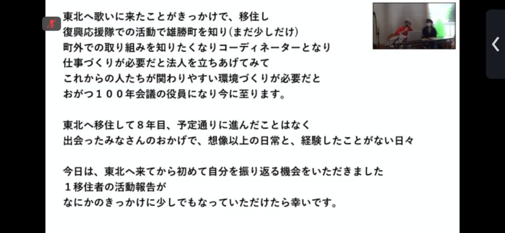 音楽を通して東北と繋がり、通い続けることで地域に興味を持って移住、そして今やずっと住んでいた人のように地域に馴染み、地元の人と一緒に雄勝を盛り上げている古田先生の決断力と行動力に、尊敬の念を持たずにいられません。