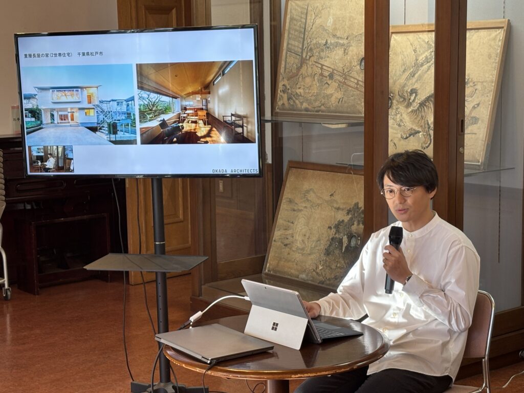 岡田先生からは、能登半島地震発災後、地元・七尾で復興に向き合ってきた取り組みについてお話しいただきました。震災直後、恩師から「地域で活動する建築家として、地域に貢献しなさい」と背中を押されたことをきっかけに、自身の仕事や立場を見つめ直し、建築士として地域に関わる覚悟を固めたと語られました。