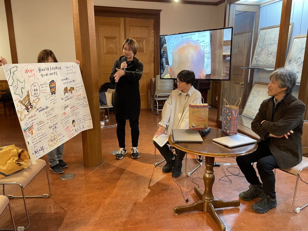 また、一本杉通り商店街では、震災前の街並みを1/100スケールで再現した復元模型を学生ボランティアとともに制作し、その模型を使いながら住民同士で未来の街のあり方を考えるワークショップを重ねていることも紹介されました。単に「昔はよかった」と懐かしむのではなく、過去の記憶を土台にしながら、これからどんな街にしていくかを考えるための道具として模型を使う。その発想に、参加者も大きく引き込まれていました。